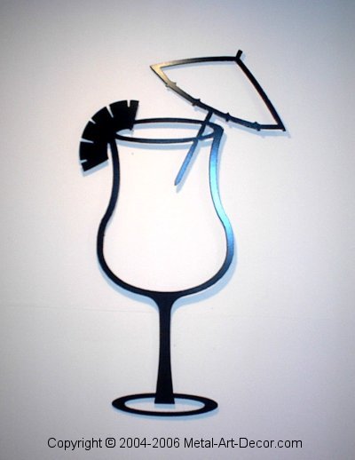 This decorative Pina Colada metal wall art silhouette is wonderful wall hanging decor for any beach restaurant, kitchen, or bar. Hang it on your wall and it will grab attention. The pina colada features a large, rounded glass, umbrella, and pina pine apple slice on the side. Martini, Margarita, and Hurricane also available.